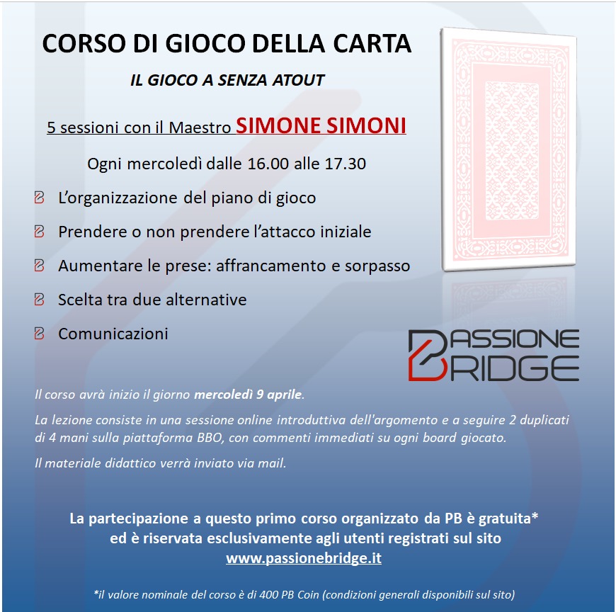 Simone è un insegnante di grande esperienza, molto conosciuto soprattutto nel Lazio, avendo anche ricoperto dei ruoli istituzionali, ed anche figura di riferimento online essendo il principale animatore di un gruppo FB che elabora delle statistiche su 3 tornei “Daylong free” che si svolgono ogni settimana su BBO.